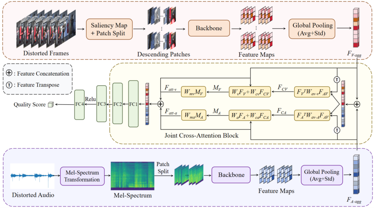传统视觉质量评价模型和现有专用音视频联合质量评价模型,在视听信号感知质量的精准评估中均存在局限性。针对这一核心挑战,本研究从人类听觉与视觉的感知特性出发,深入剖析双模态信号间的内在交互作用机制,进而提出一种专为音视频质量评估设计的新型多模态交叉注意力引导网络。实验结果证明,该模型能够自动、有效地评价视听信号的联合体验质量,且评价结果与人眼视觉及人类听觉感知系统保持较高相关性。该成果有望应用于流媒体服务质量优化、VR/AR沉浸式媒体体验保障等核心场景,可作为音视频编码算法优化等增强技术的客观评估基准,为音视频产业的高质量发展提供技术支撑。