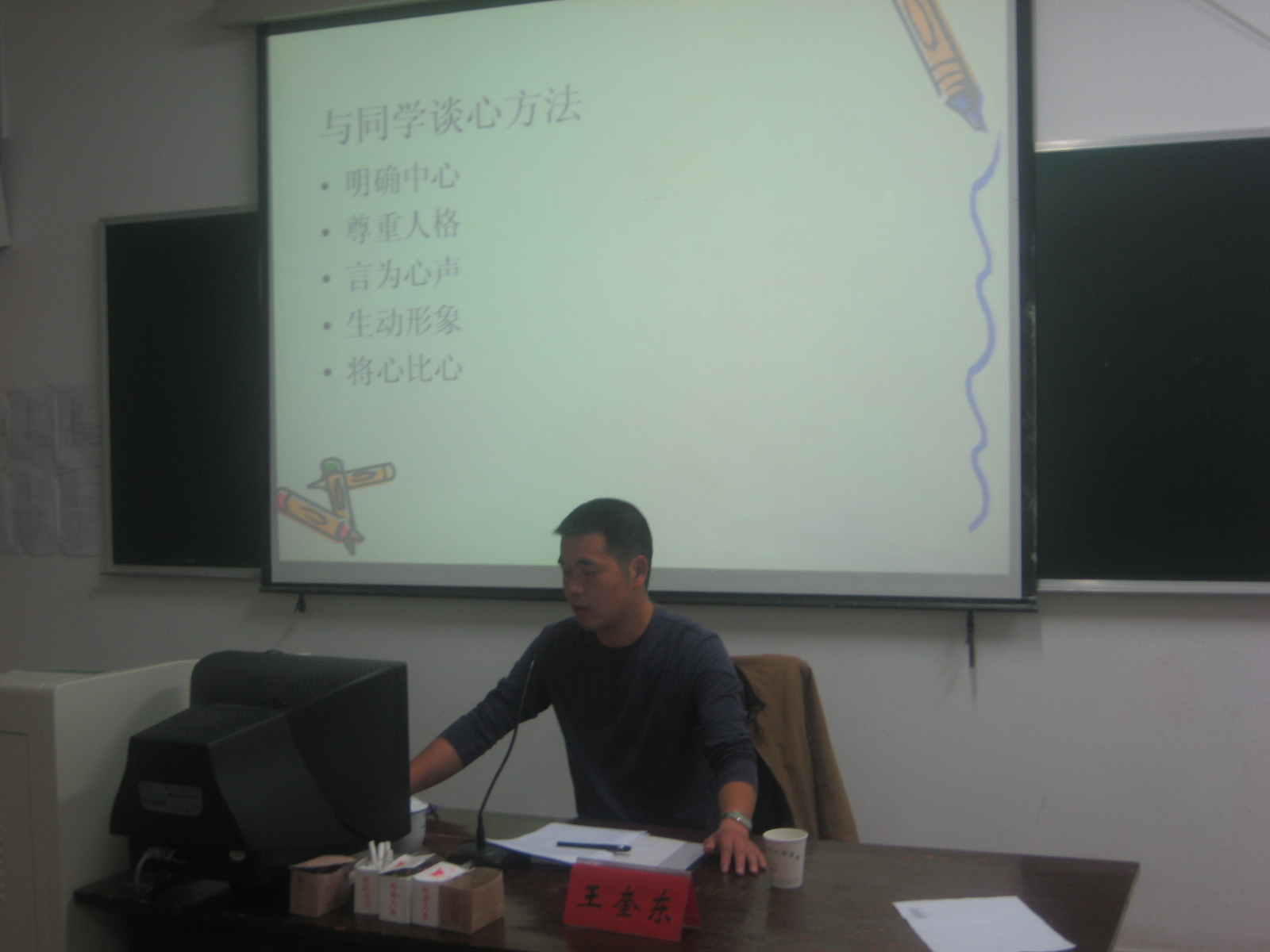 王书记从“学生干部的作用”、“为什么要当学生干部”、“如何当好学生干部”、“学生干部应有的工作态度”等几方面讲述了我们应该如何做好学生干部。在讲课的过程中,王书记也指出了现阶段学生干部做事中存在的一些问题,希望大家改进。他同时也提出了一些要求,期望我们学生干部在今后的工作学习中,能起带头作用,能有所提高。