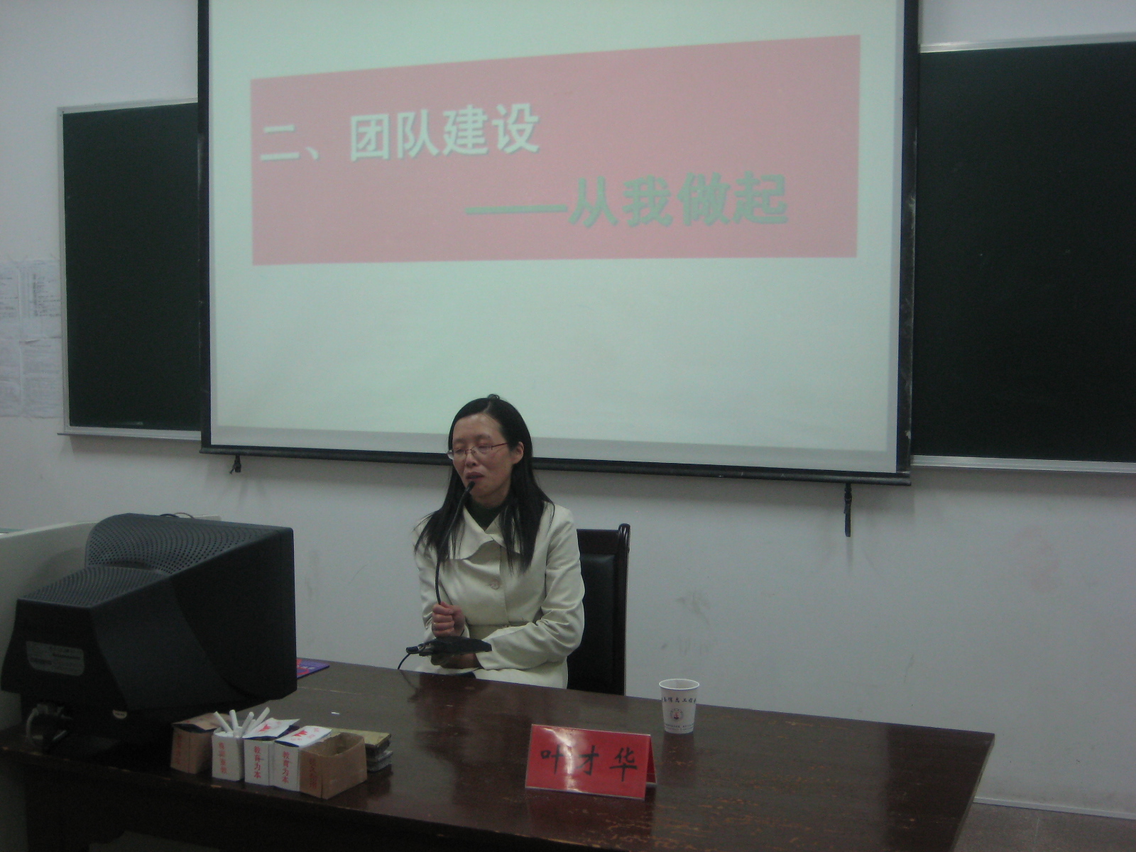课上,叶老师就“什么是团队”、“团队中所需要的人才”及“如何建设团队”等方面为同学们做了详细的叙述。同时。她也指明了团队合作的重要性和成功性。此外,叶老师以许多成功的企业家为例,展现了他们成功必不可少的团队合作能力。在结束时,叶老师祝愿学生干部们能在今后的团队中成功和成才。
