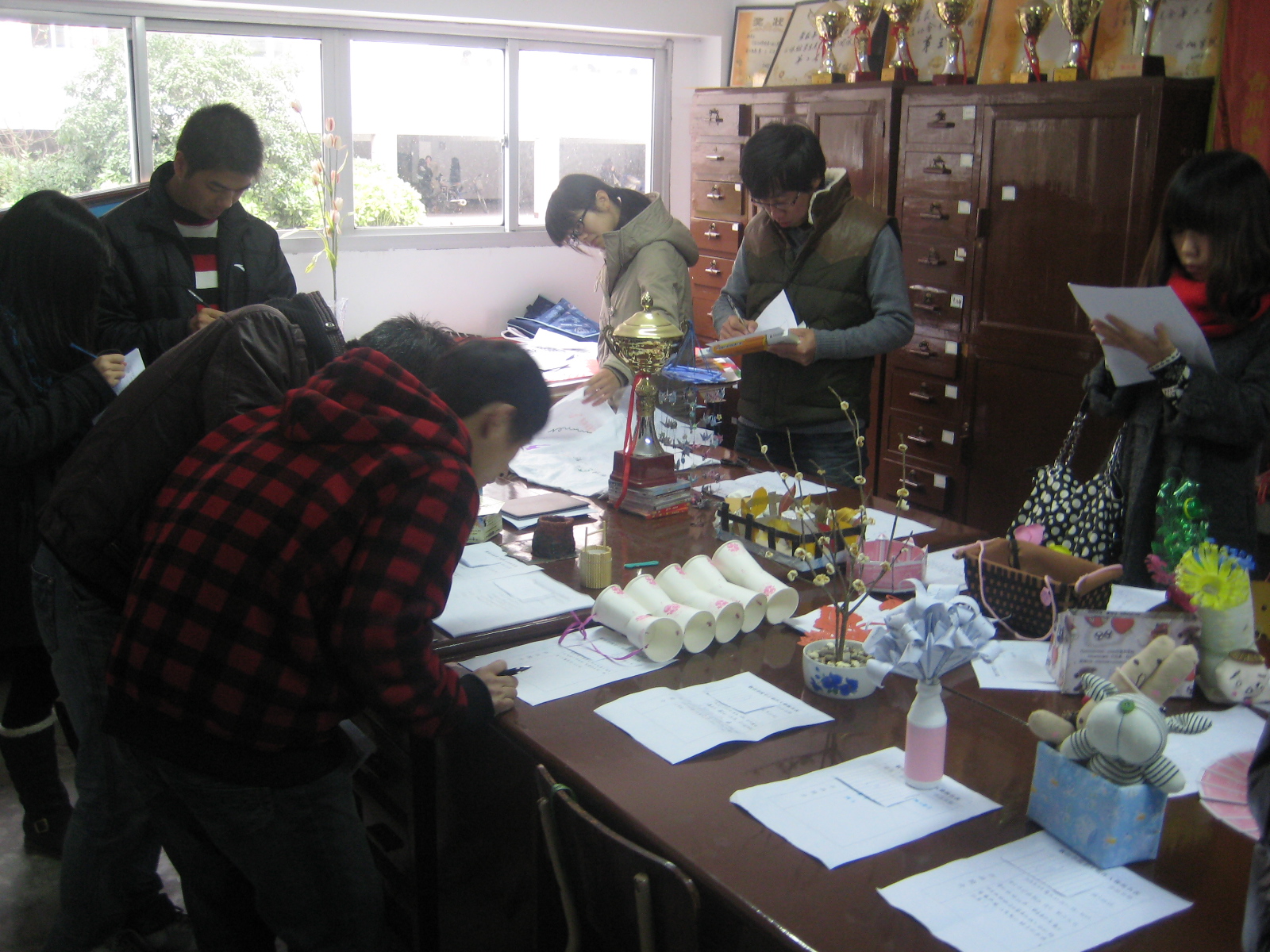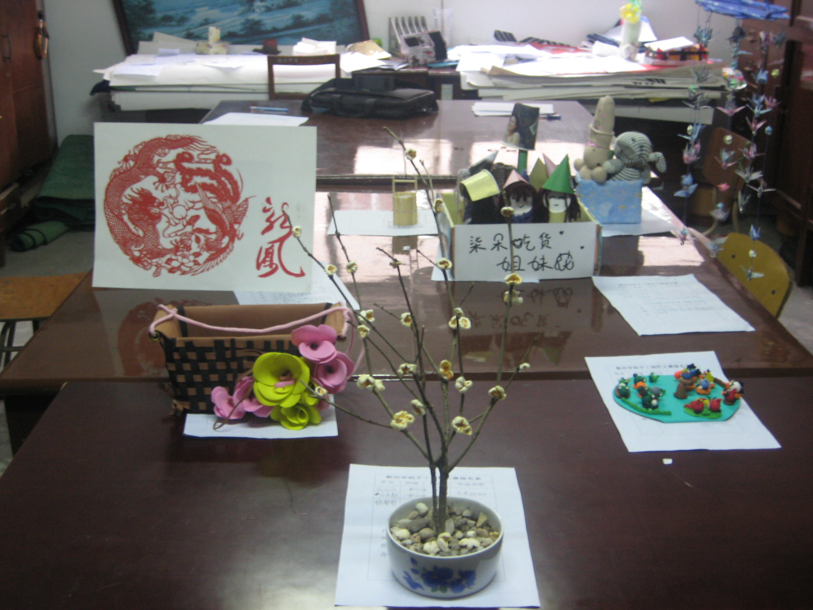 我院团学会办公室里摆放着各式各样的手工艺参赛作品,每件参赛作品都创意新颖,手工精美。一盆“凌寒独自开”的寒梅首夺评委的眼球。它是由吃剩的爆米花,嫌弃的小花盆,干枯的树枝及路边的小石子制作而成,融入了环保、创意等元素,构思巧妙,美观大方,获得了一等奖。此外,“我也是花”,“Angry Birds DIY软陶公仔系列”获得二等奖,获得三等奖的是“笑脸娃娃”、“风色幻xiang”及“龙凤”剪纸。