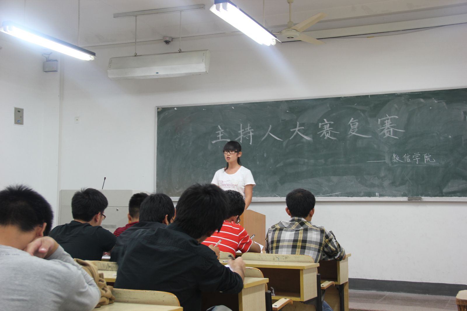 经过预赛的激烈比拼,20名选手脱颖而出,挑战复赛。这次比赛,在过去的“晚会开场””自我介绍”以及“才艺展示”的基础上创新增添了“临时串词”环节, 大大的考验了选手的口头表达和灵机应变能力。比赛现场随处弥漫着青春的活力,洋溢着自信的风采。评委们中肯的点评也让选手们深刻地感悟到自身的不足。最后俞丁丁、黄梦婷、王博文等8位选手顺利进入决赛,定于11月6日进行最后的角逐。