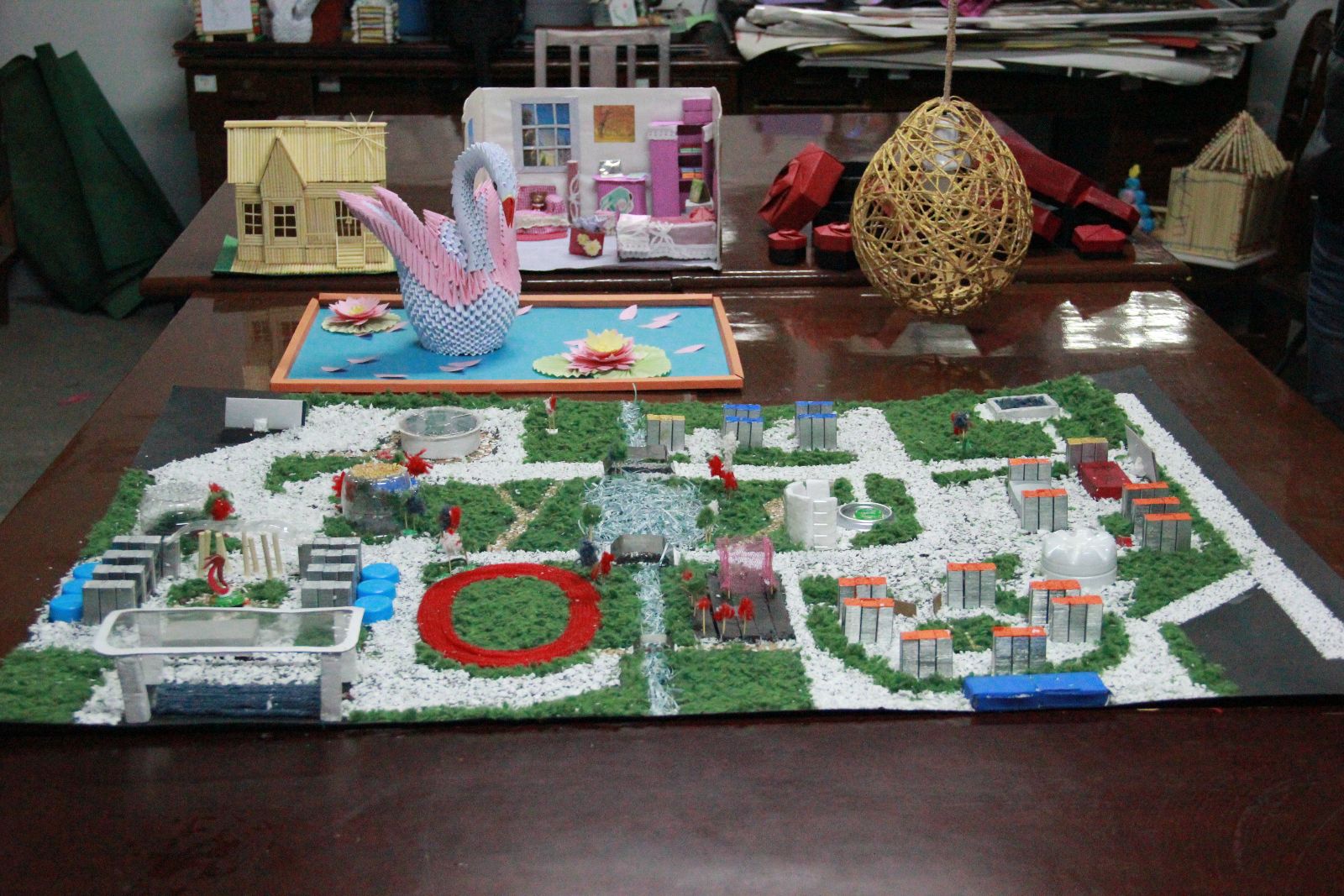 据悉,本届手工艺大赛旨在促进文明寝室建设,贯彻绿色中国理念。让同学们在“我手秀我型”的过程中,变废为宝,节约寝室空间,实现资源的再利用,将环保理念融入到实际生活中。此外,同学们在提高动手动脑能力的同时,树立了节俭、环保的价值观,全面发展德智体美劳。同时以寝室为单位的参赛方式促进了寝室之间的交流,提升内部的团结协作精神,加强凝聚力。精妙纤纤五指动,荟萃栩栩千品生。气势磅礴的全景图,小巧别致的球形灯。洁白天鹅实现“美丽蜕变”,温馨居室成就“浪漫满屋”。