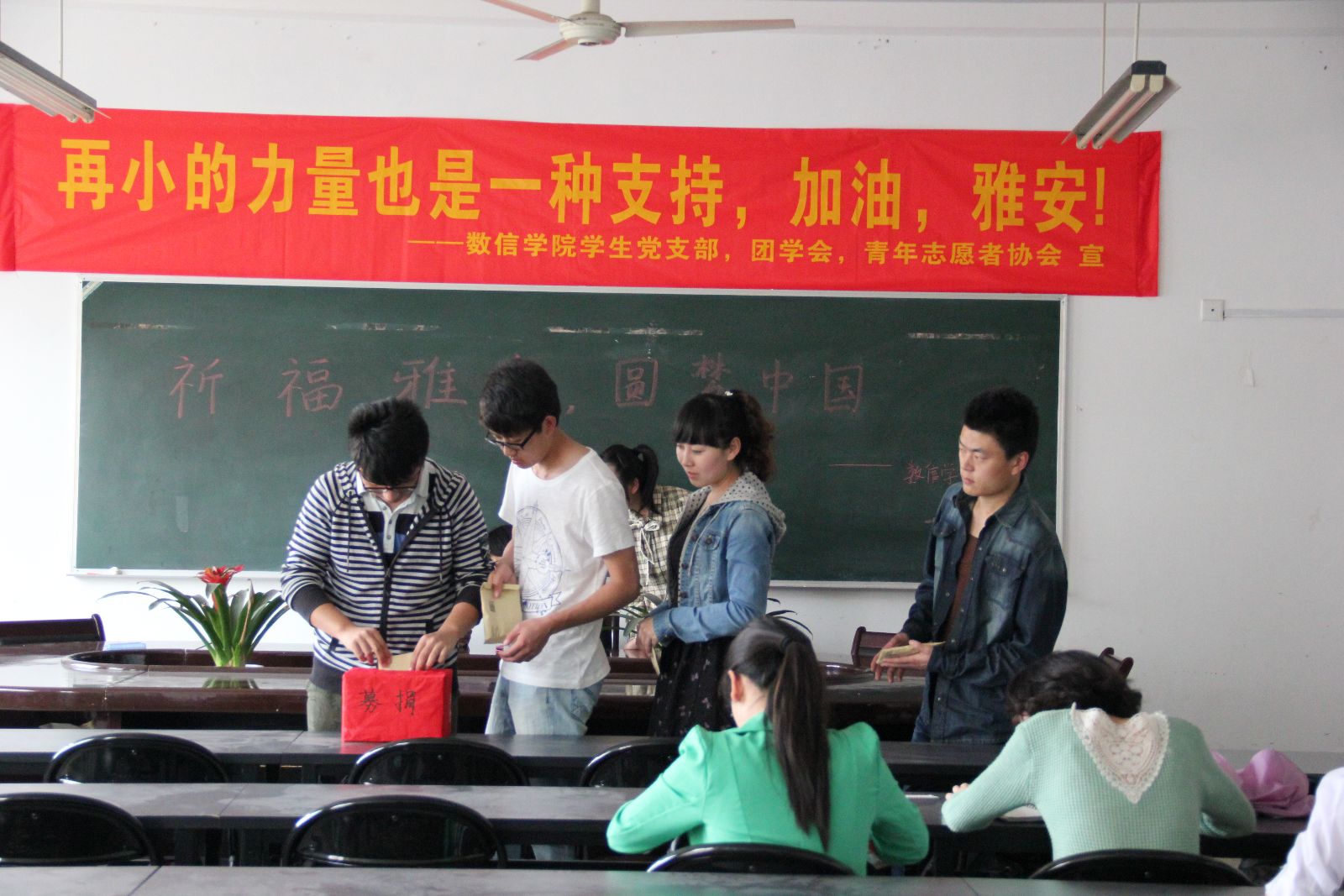 活动以募捐为主,分为三个环节:倡议书宣读,为雅安默哀3分钟以及依次捐款。同学们热情高涨,经过大家的积极努力,我院共募得3687.8元人民币,这些善款将尽早送到灾区人民手中,纾灾民之困,解黎庶之忧。