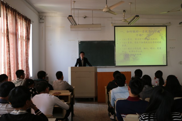 培训会由团学会组织部副部长金鑫主持,分为三个议程进行。张鹏老师以《团学漫谈》为主题首先发表讲话,就学习、素养、工作态度、创新四方面对“如何做一名优秀的学生干部”进行解说,期间更结合具体事例进行分析。同时要求团学会成员树立“为同学服务”的宗旨,发挥模范带头作用。紧接着13届团学会办公室主任黄梦婷同学针对通知、会议、值班三种情况下的礼仪进行说明。培训会最后,团学会主席刘鑫同学对各干部干事提出要善于保持乐观向上的学习、工作、生活态度等要求。