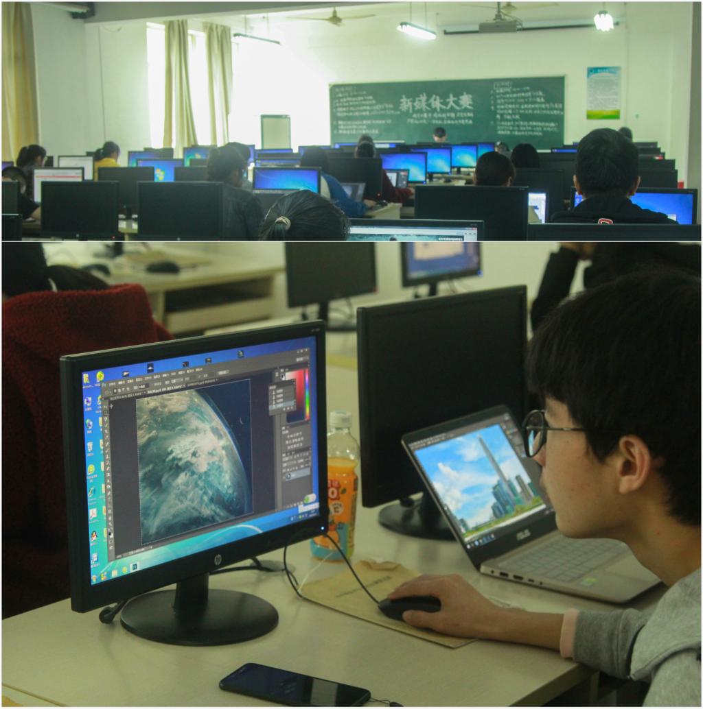 本次活动分为图片处理、视频制作、微推制作三个模块,其中图片处理以未来科技世界为主题,短视频和微推以展示电信学院风采为主题。比赛现场,参赛选手快速地敲打着键盘,娴熟的技巧,灵敏的思维,活跃的灵感,使比赛的氛围更加浓厚。一幅幅作品彰显出了同学们匠心独运的思路,也诠释了自己的设计灵感和内涵,本次比赛不仅仅是一次专业技能水平的检验,更是他们学习过程中的一种锻炼和实践。赛场秩序井然,展现出我校学生比赛中良好的精神风貌和自信。
