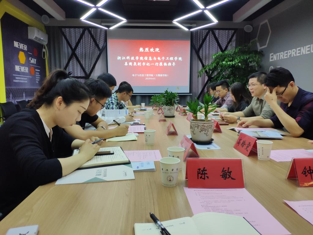 4月23日上午,浙江科技学院信息与电子工程学院党委副书记姜国泉一行来我校电子与信息工程学院,就校园文化建设、学风建设、招生就业工作、国际交流、校企合作、校友工作等进行专题调研交流。电信学院党总支副书记冯荣主持交流座谈,副院长王超、全体辅导员参加。