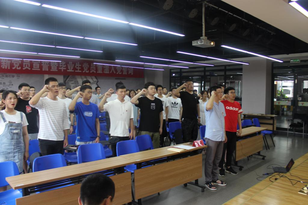 宣誓仪式在嘹亮的《国际歌》中拉开帷幕。冯荣副书记带领全体党员庄严宣誓:“我志愿加入中国共产党,拥护党的纲领……”。