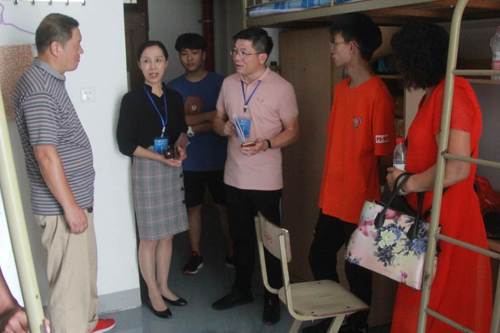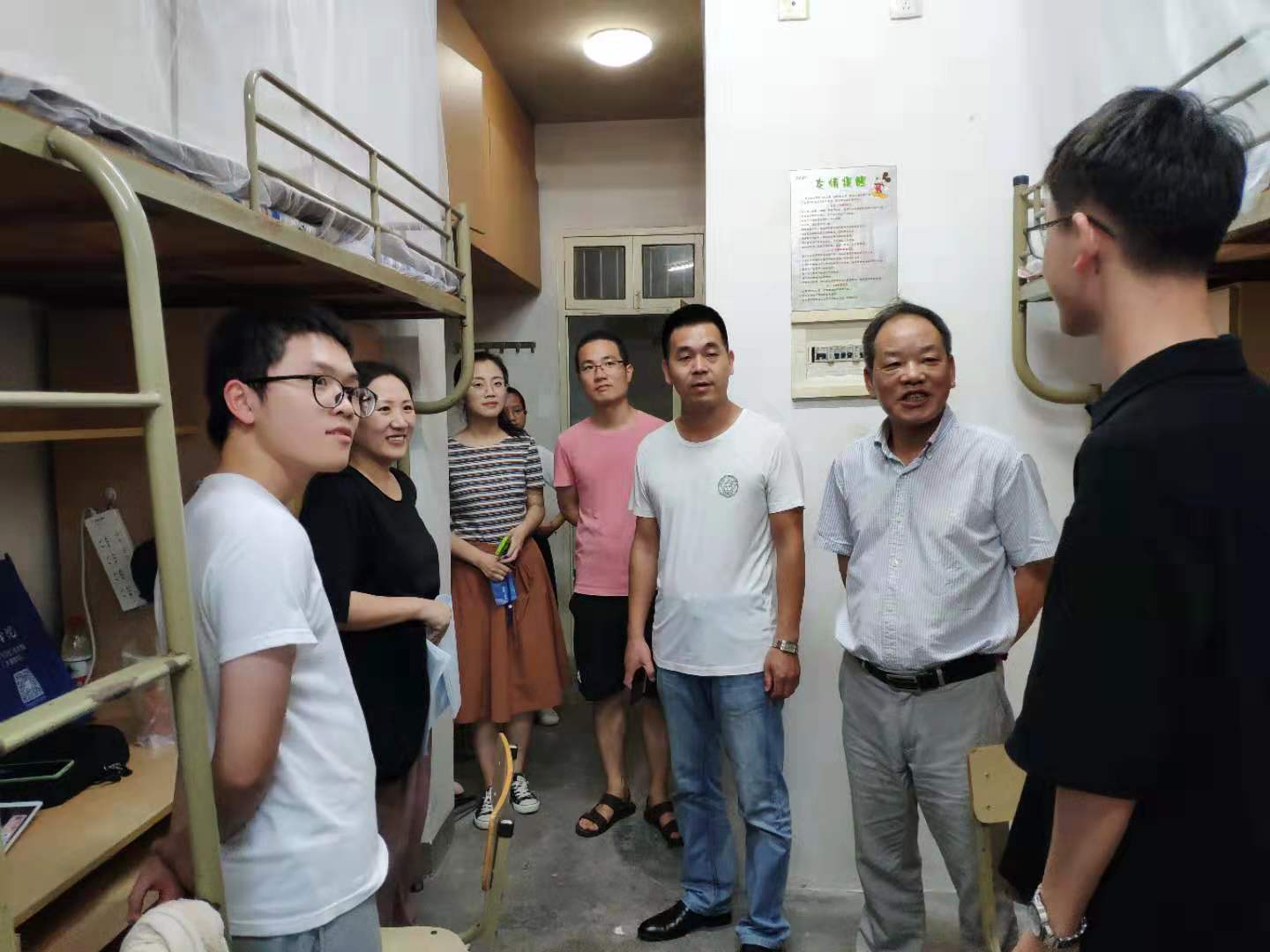 为了解新生入学的住宿和生活情况,及时解决同学们在生活中遇到的困难,引导新生尽快适应新生活、新环境。9月7日下午,电信学院院长陈英才、党总支书记王奎东、副院长苏岐芳、党总支副书记冯荣及全体辅导员及班主任分校区走访2019级新生宿舍。