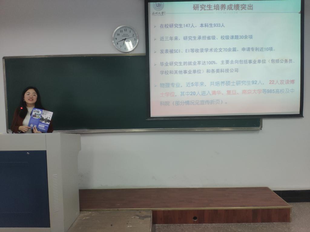 据陈奔腾介绍,温州大学数理学院现有微纳结构与光电器件、物质科学与工程、复杂系统动力学、量子系统与调控、激光与光电子五个学科方向。学校物理学科排名靠前,培养研究生优势显著;师资力量雄厚,教授、博导、副教授众多;学院拥有良好的实验平台,实验环境优良。陈奔腾还就研究生招生奖助政策、一级硕士点情况、教师学术队伍等作了具体介绍。在场同学认真听讲并提出疑问,现场交流激烈、气氛活跃。