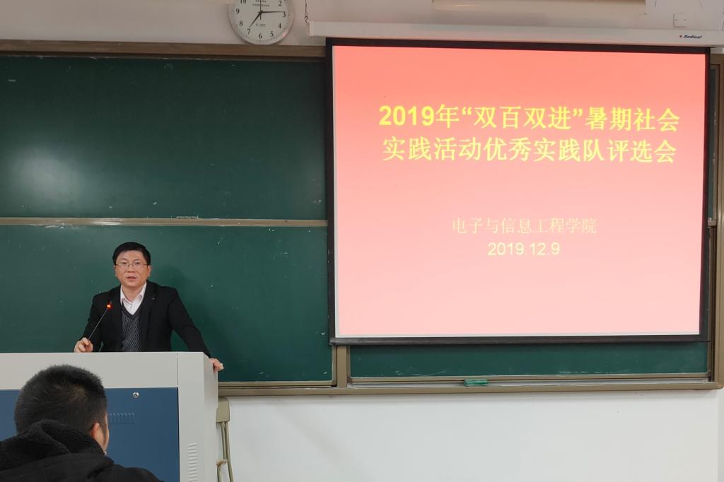 电信学院于12月9日晚在2202教室举行2019年“双百双进”暑期社会实践活动优秀实践队评选会。电信学院党总支副书记冯荣、辅导员周吉、沈迪及各实践队代表、各班学生参加交流会。
