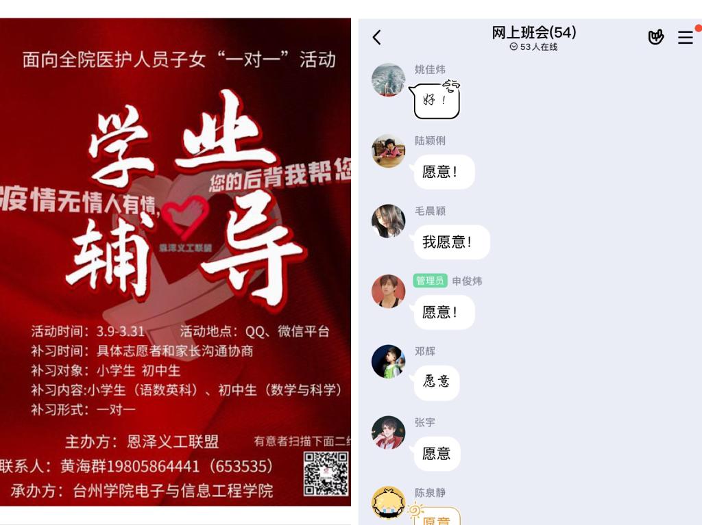 奋战在抗疫前线、为人父母的医护人员们,最牵挂的莫过于家中的孩子。3月5日,电信学院分团委面向全院学生发布“最美志愿者”招募令,号召同学们积极参加本次极富意义的线上“阳光家教”活动,为台州抗疫第一线的医护人员子女提供爱心学业辅导的服务。同时,学院高度重视本次活动,搭建了完善的志愿服务考核及激励机制:根据志愿报名的类别、专业,按照比例进行统筹计划和详细分类。在教辅开始前集中培训指导;在服务期间统计志愿服务的时长,追踪补习的效果反馈;在志愿服务结束后,向志愿者颁发由院志协统一认定的证书。这一机制的建构有力保障了本次“阳光家教”活动的顺利开展,活动一经发布,来自院属学生组织的青年党员、团员先锋、学生骨干等纷纷请战。据不完全统计,截止3月12日,报名人数已达105名,由此便组成一支给力的线上“阳光家教”志愿服务队伍。志愿者们提前备课,细心为每位学生制定专属的辅导方案,进行包括作业答疑、在线课程辅导、网上家教及心理疏导等一对一精细化服务。截至目前,来自台州医院、台州市中心医院等近20多名医护工作者纷纷为子女报名,引起较大反响。