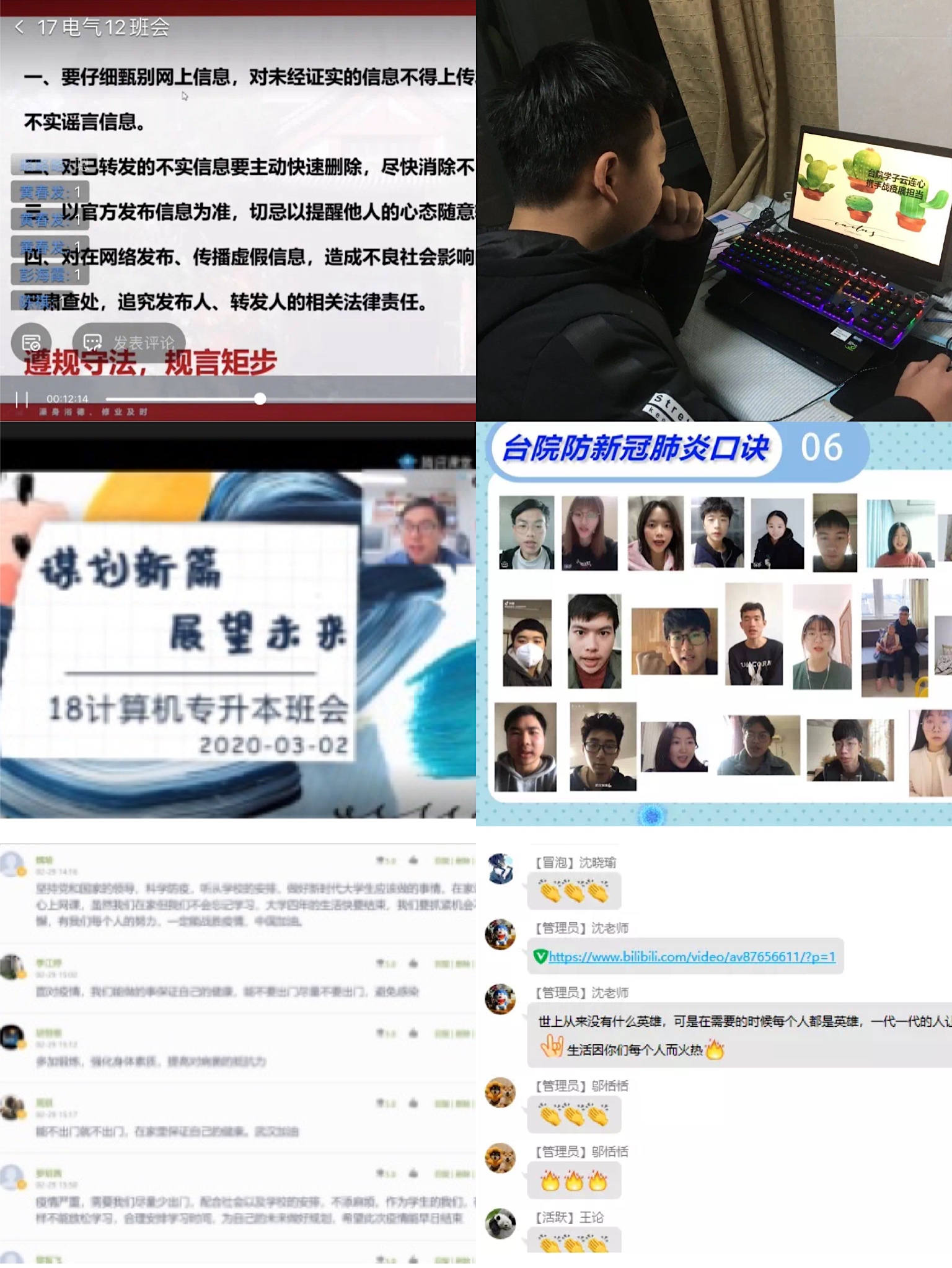 本次线上主题班会,电信学院各年级辅导员、班主任带领同学们围绕大学生紧密结合当下疫情防控实际,分别从“主动担当、听党指挥、珍惜生命、致敬英雄、加强自律、关爱心灵、谋划新篇”等7个方面入手,向同学们传达了学校的相关文件精神和教学安排,并强调同学们要积极配合学校的相关工作,每日按时打卡上报健康情况,未经允许,不得提前返校,坚决贯彻落实“零报告”制度,做到不缓报、不漏报、不误报和不瞒报。在做好疫情防控的主题教育和思想政治教育的同时,学院同样重视学生的在线教学工作,尤其强调特殊时期的班风、学风建设问题。班主任、辅导员通过线上班会了解了学生目前在线学习的准备状况和存在的实际问题,做好心理疏导和在线帮助工作。对学生尤为关心的补考、转专业及在线教学的具体问题,班主任、辅导员也进行了热情、具体、详细的解答。