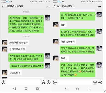 学院党政班子、年级辅导员、班主任倾听了陈玲佳同学的防疫心声,了解了她目前的学习生活情况,送去来自学校和学院的关怀与慰问,并鼓励身处国外的学子坚定信心,加强防控,不忘学习,有什么困难一定及时联系学校和学院,学校与学院定将通过多方渠道帮助解决。陈玲佳同学表示十分感谢学院党政班子、师生对自己的关心和问候,目前学校已经停课,自己正宅家抗击疫情,口罩,食品等生活物资比较充足,也有信心度过这段艰难时期。