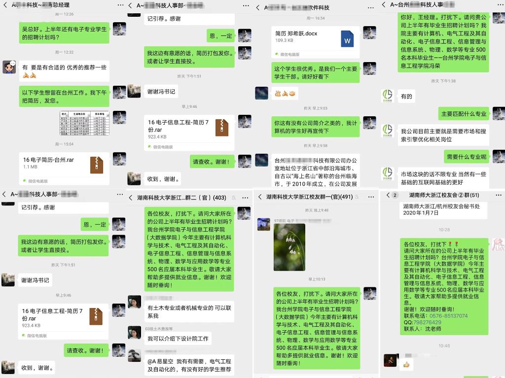 学校3月18日就业工作专题会议召开后,学院更是迅速贯彻落实会议精神,针对毕业生就业现状,不等不靠、主动出击,发挥校地合作优势、教师资源优势、校友互助优势,积极与浙江芯丰科技有限公司、浙江星星科技股份有限公司、中新科技集团股份有限公司、台州金友通软件科技有限公司、台州哲商网络技术有限公司、台州新睿电子科技有限公司、台州毅挺科技有限公司、浙江知水信息技术公司、浙江大华技术有限公司、浙江双环传动机械股份有限公司等20余家用人单位,台州学院雇主联盟、台州学院电信校友会、湖南科技大学浙江校友会、湖南师范大学浙江校友会等多家交互平台取得联系,牵线搭桥推荐学生简历,增强就业帮扶的主动性,扩大毕业生在特殊时期的择业范围。仅3月24日、25日两天,学院党总支副书记冯荣就直接向企业高管、HR等投递了学生简历36份。此举,不仅受到毕业生们的普遍欢迎,同时还受到了湖南科技大学信电学院院长吴亮红、湖南师范大学浙江校友会秘书长张华等社会各界人士的点赞和支持。