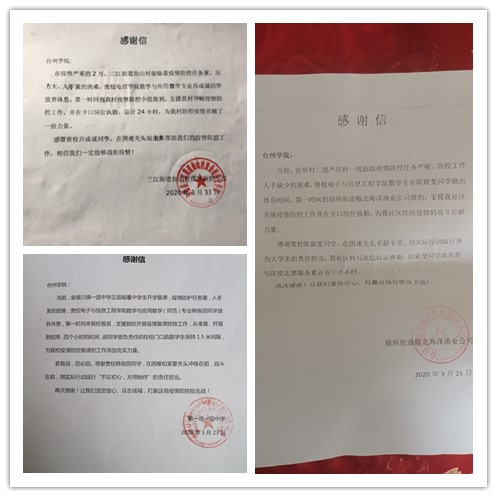 近日,新疆生产建设兵团第一师一团中学、浙江省温州市永嘉县三江街道仙山村、浙江省台州市椒江区前所街道椒北方海洋渔业公司发来感谢信,对我院志愿者服务工作表示肯定与信任。疫情期间,我院青年学生志愿者放弃自己的休息时间,积极参与到各项抗疫志愿服务中。