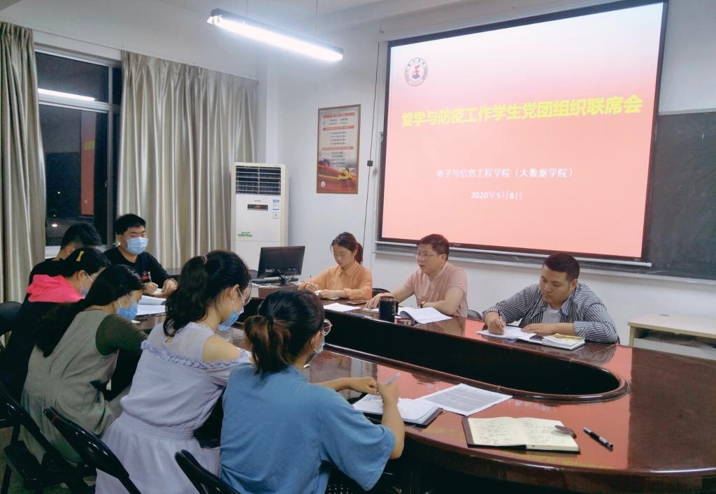 5月8日,电信学院分校区召开复学与防疫工作学生党团组织联席会,学院党总支副书记冯荣出席,学生党支部书记、分团委书记、有关辅导员及学生党员先锋队、学生会等学生党团组织主要负责人参加。