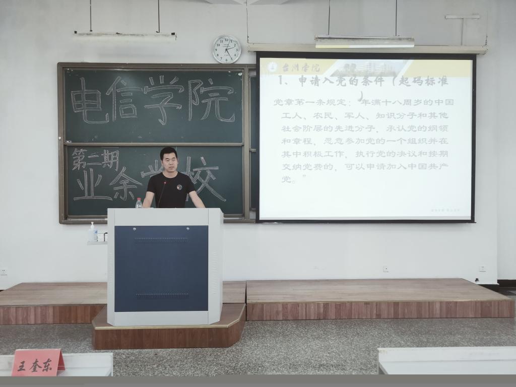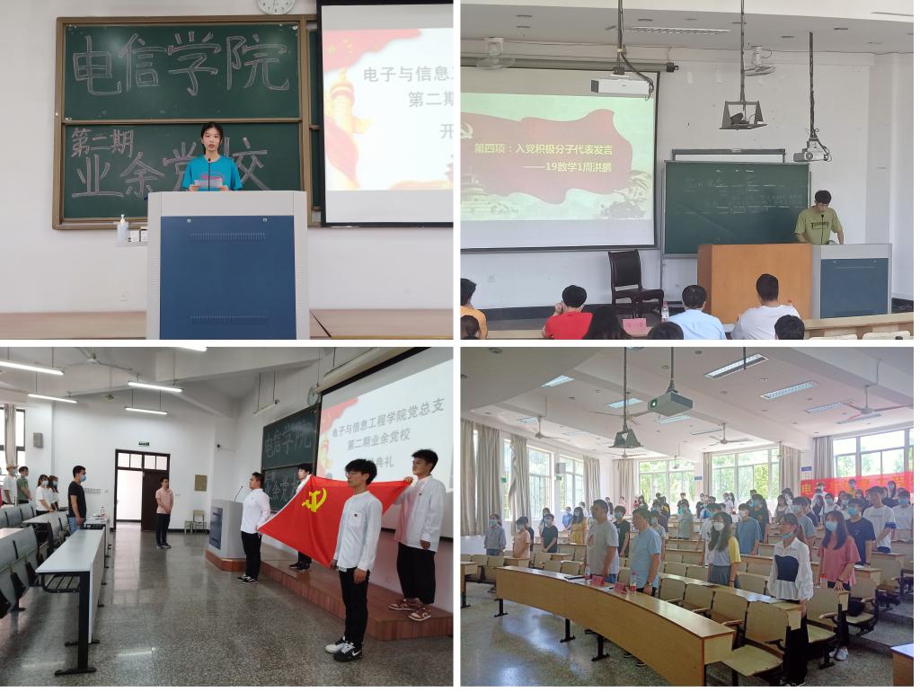 5月24日,电信学院分校区举办第二期业余党校开学典礼暨党课开课仪式。学院党总支书记王奎东、副书记冯荣分别作开班动员讲话并为学员授课。物理与电子学生党支部书记陈敏、分团委书记沈迪分别主持仪式,学生党员代表、先锋队成员及202名入党积极分子参加。