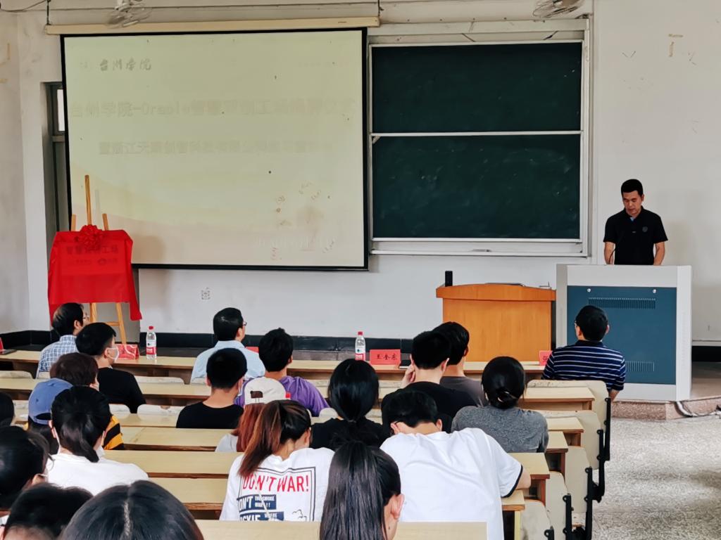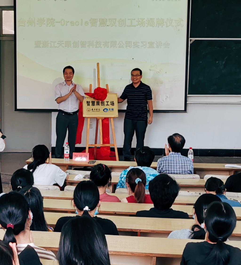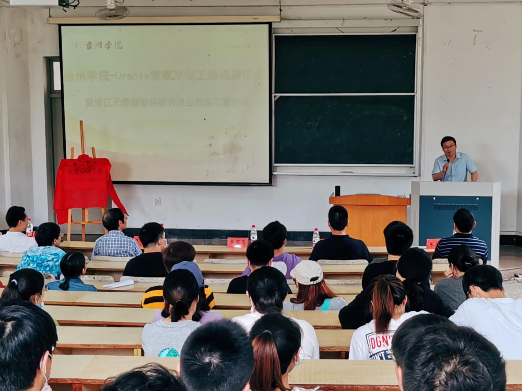 为了进一步加强校地共育与产学研合作,推进大学生创新创业,提高学生实际操作水平,电信学院经过与天眼集团下属浙江天眼创智科技有限公司多方洽谈,达成了共建台州学院-Oracle智慧双创工场的共识,并于6月11日下午在临海校区隆重举行了揭牌仪式。天眼集团副总裁唐百喜、浙江天眼创智科技有限公司总经理谢冠雄,校地方合作处处长王金宝、电信学院党总支书记王奎东、副院长张石清以及2017级计算机、信息管理专业师生代表共130余人参加了揭牌仪式,计算机系主任陈盈主持了本次仪式。