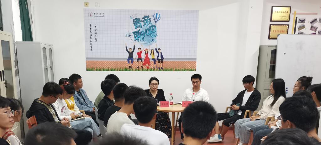 10月16日晚,电信学院在椒江校区举办第15期青亲聊吧活动,学院党总支委员董立达应邀参加,以“遇见﹒最美”为主题,与同学们进行互动交流。活动由学院辅导员陈敏主持,20级新生代表参加本次聊吧活动。
