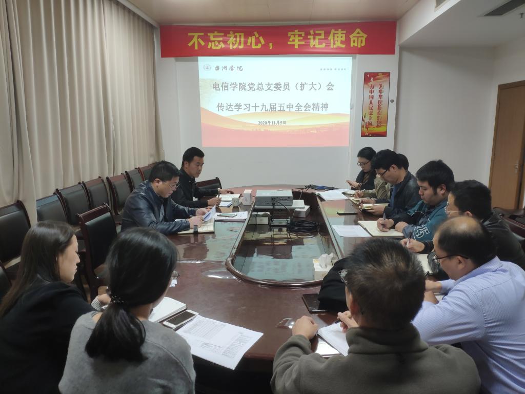 11月5日,电信学院召开党总支委员(扩大)会传达学习党的十九届五中全会精神,党总支委员、支部书记、各系室负责人参加会议。