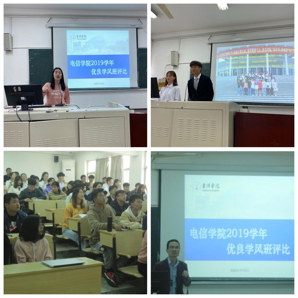 11月5日,电信学院在临海校区开展2019学年优良学风班评审会。辅导员陈婷婷、郑行出席,学院各班代表分班级进行展示,大一各班学生代表现场观摩。
