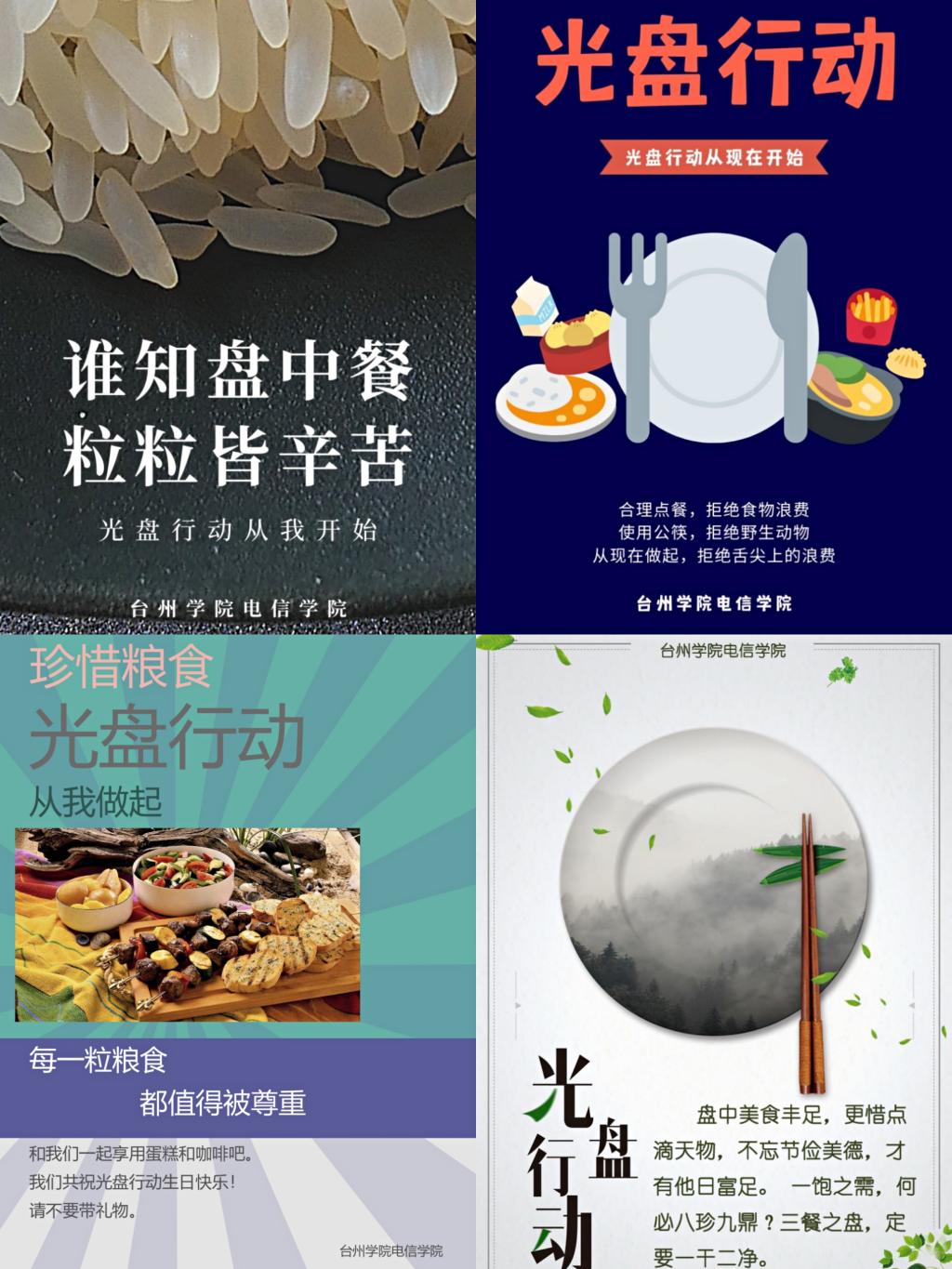 为贯彻落实习近平总书记关于坚决制止餐饮浪费行为的重要指示精神和教育部《教育系统“制止餐饮浪费培养节约习惯”行动方案》,电信学院组织开展了“节约粮食,从我做起”系列活动。此次系列活动旨在倡导新时代的大学生发扬珍惜粮食,勤俭节约的传统美德,把节约意识根植于心,外化于行。“三位一体宣传”包括“线上班级‘光盘’秀”、“‘节约粮食’海报设计活动”、“‘节约粮食,从我做起’主题班会活动”三种宣传活动。