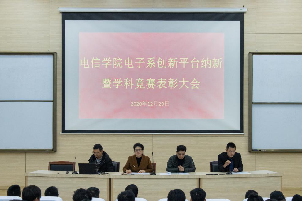 为推动学生创新平台建设,激发学生学习和应用专业知识热情,12月29日晚上,电信学院在学术报告厅召开学生创新平台纳新暨学科竞赛表彰大会。电信学院党总支委员董立达、电子系副主任汪洋、电子系副主任周强、各创新平台负责教师、学科竞赛获奖学生代表及19、20级电子系全体学生参加。