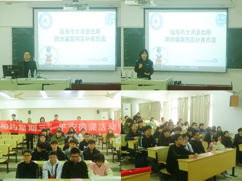 为进一步提高学生的防诈骗能力,推动平安校园建设,近日校保卫处主办的“相约星期三”平安微课活动走进电信学院,举行防诈骗安全教育专题讲座;临海市公安局大洋派出所法制宣讲团成员吕警官应邀担任主讲。