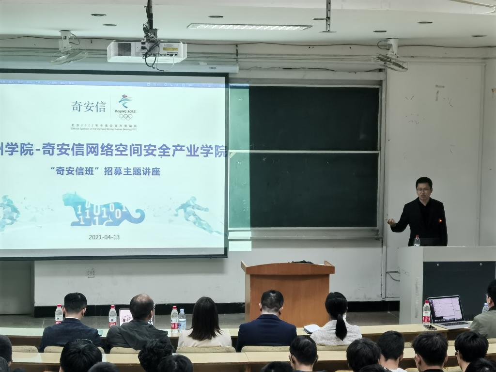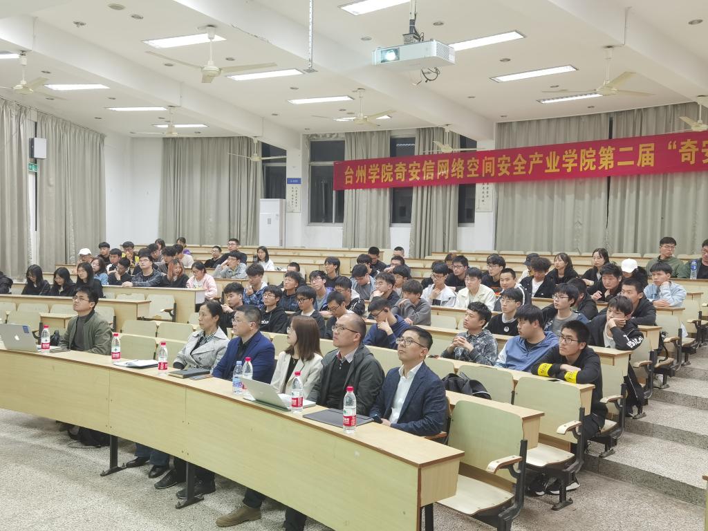 2021年4月13日晚,台州学院-奇安信网络空间安全产业学院第二届“奇安信班”拔尖创新人才招募主题宣讲活动在临海校区A5大教室隆重举行。奇安信集团浙江分区总经理林尚晓、浙江安全服务总监洪文智、浙江台州分区经理王恒剑等应邀出席并做招生宣讲。电信学院执行院长苏岐芳、党总支副书记冯荣、计算机系主任陈盈、年级辅导员沈迪以及计算机系师生代表共130余人参加。