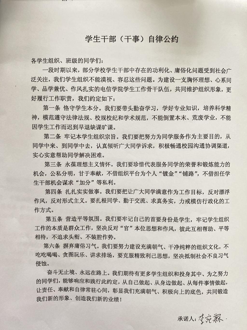 会议伊始,吴佳妲总结了上学期学生管理的各项工作,肯定了班委过去在学生自我管理等方面取得的成绩,同时对新学期学习和生活中的工作进行了部署,督促班委们熟知并签署《电信学院学生干部自律公约》,恪守学生干部职责,坚守服务同学初心,以饱满的热情投入到新学期的工作中。