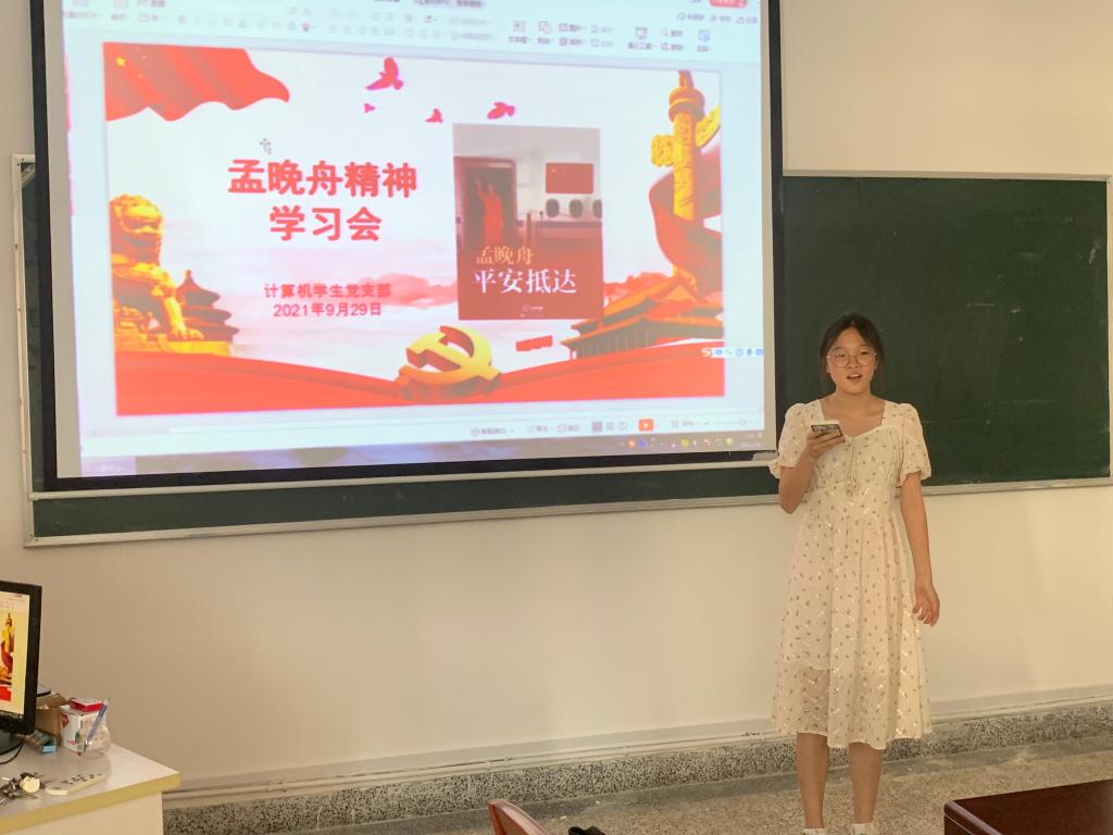 在党日活动中,学生党支部党员以孟晚舟女士回国为主题,向大家娓娓阐述了中国力量的强大。9月25日,孟晚舟女士乘坐中国政府包机回归祖国怀抱,人们热情迎接,机场温暖喊话,从扣押到归国,1028天,孟晚舟女士终于回归祖国的怀抱,这也表明没有任何力量阻挡中国前进的步伐!民族在复兴,祖国在壮大,国家实力的强大,让中国成为我们每一个国人的骄傲与最坚强的后盾。“有五星红旗的地方,就有信念的灯塔,信念有颜色,那一定是中国红!”主讲人念到此处激情昂扬,整个现场激发出大家的爱国热情,掌声经久不息。