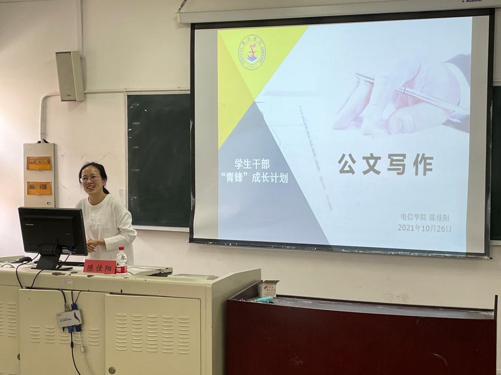 为提升新一届团学组织学生骨干的公文写作能力,10月26日中午,电信学院举办“青锋成长计划”第五讲“学生干部公文写作”专题培训,特邀辅导员陈佳阳分享公文写作的经验,学院全体学生干部参加了本次讲座。