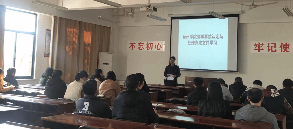 王超首先介绍了学院的教学相关工作及现状,随后对《台州学院教学事故认定与处理办法》进行了条例解读,提醒教师们讲原则,守规矩,上好课。最后,分析毕业论文指导工作及课程考核归档工作中的问题与新进教师交流与讨论,提出新教师应尽快熟悉情况,迅速进入角色,融入到电信学院大家庭。