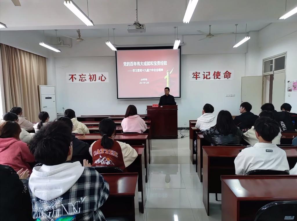 王奎东从深刻认识党的百年奋斗历史的重要意义、深刻认识党的百年历史伟大成就、深刻认识中国共产党百年奋斗的历史意义和深刻认识党百年奋斗宝贵的历史经验四个方面对全会精神和审议通过的《中共中央关于党的百年奋斗重大成就和历史经验的决议》进行了解读。王奎东强调党的十九届六中全会是在“两个一百年”奋斗目标历史交汇关键节点上召开的一次重要会议,他要求同学们要认真学习领会全会精神,以高度的思想自觉不断深化学思践悟,深刻领悟中国共产党为什么“能”?马克思主义为什么“行”?中国特色社会主义为什么“好”?