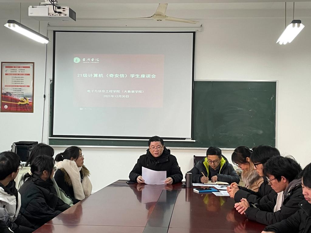 12月30日,电信学院召开了奇安信产业学院2021级学生代表代表座谈会,广泛听取学生的意见和建议,切实帮助解释和解决学生普遍关切的问题。院党委副书记、纪委书记冯荣出席并主持座谈会。计算机系主任陈盈,辅导员陈佳阳,教务员王英华和奇安信产业学院2021级15名学生代表参加会议。