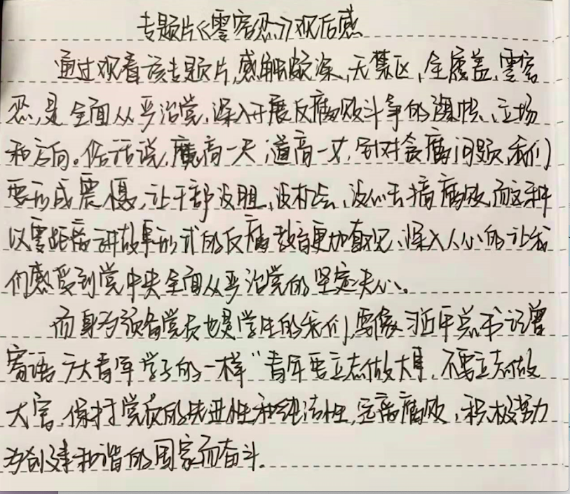 《零容忍》专题的播出让师生们明白制度之下不允许一丝违规违纪违法之势,官员之中不允许一毫贪污腐败之行。师生党员、青年团员们要树立正确的权力观,恪守本心,在党的领导下不忘初心砥砺前行。