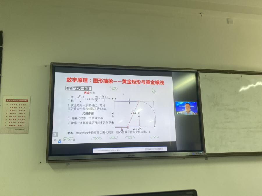 课程之初,吴春燕以鸟叫声引入,通过听觉欣赏与创作,让学生发现在时间布局上音乐中高潮点的特殊,而后由吴海燕用数学中黄金分割比的知识点来对其进行讲解。其次,由郑怡静提出建筑与美术创作中所用到的螺旋线,再由吴海燕用数学语言来讲述螺旋线的画法以及介绍黄金矩形和黄金螺旋线的概念。讲解完知识,由郑怡静带领学生用黄金螺旋线进行艺术创作。接着,郑永斌讲述大自然中所存在的普遍性的等角螺旋线和特殊的黄金螺旋线,由吴海燕对等角螺旋线进行一定的解释。课程末,吴海燕请同学们讲述了对本节课的感受,同时,对本堂课所学的内容进行了小结。