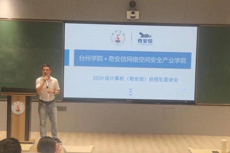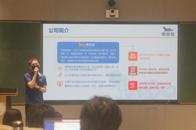 奇安信集团作为中国企业级⽹络安全领军企业,为我国冬运会提供⾼质量的⽹络安全服务。讲座伊始,奇安信网络空间安全产业学院副院长陈盈详细介绍了“奇安信班”的人才培养思路、班级建设情况,以及20级计算机“奇安信班”学员的招生方案。