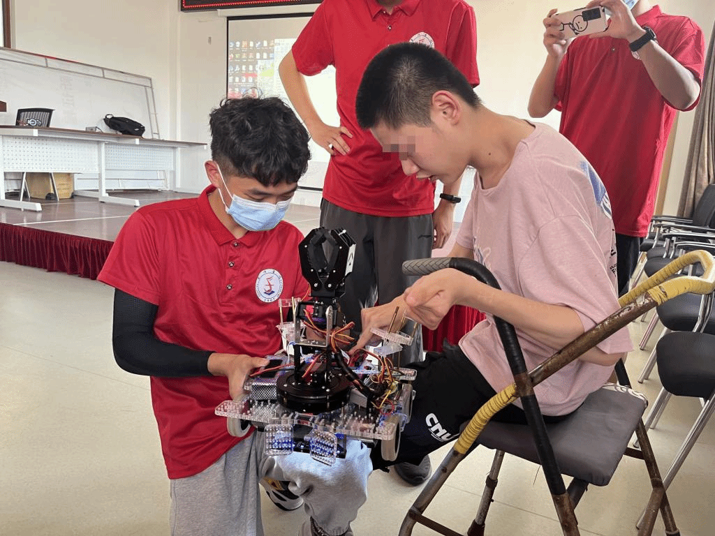 实践队兵分两路,一路实践队队员为培智学校的孩子们带来了智能小车、机器人,通过对照实物和观看视频讲解,实践队向孩子们形象地展示了小车的结构和功能,吸引了孩子们好奇的目光。讲解后,实践队队员带着实物来到孩子们中间,和孩子们近距离的互动,场面十分温馨热烈。之后,实践队同孩子们一起进行手工折纸,有的折成了飞机,有的折成了小船,还有的折成了青蛙,现场一片欢声笑语,孩子们脸上洋溢的真诚笑容让人动容。