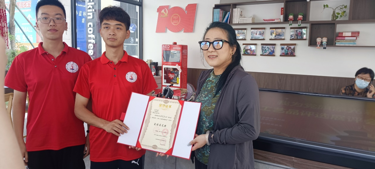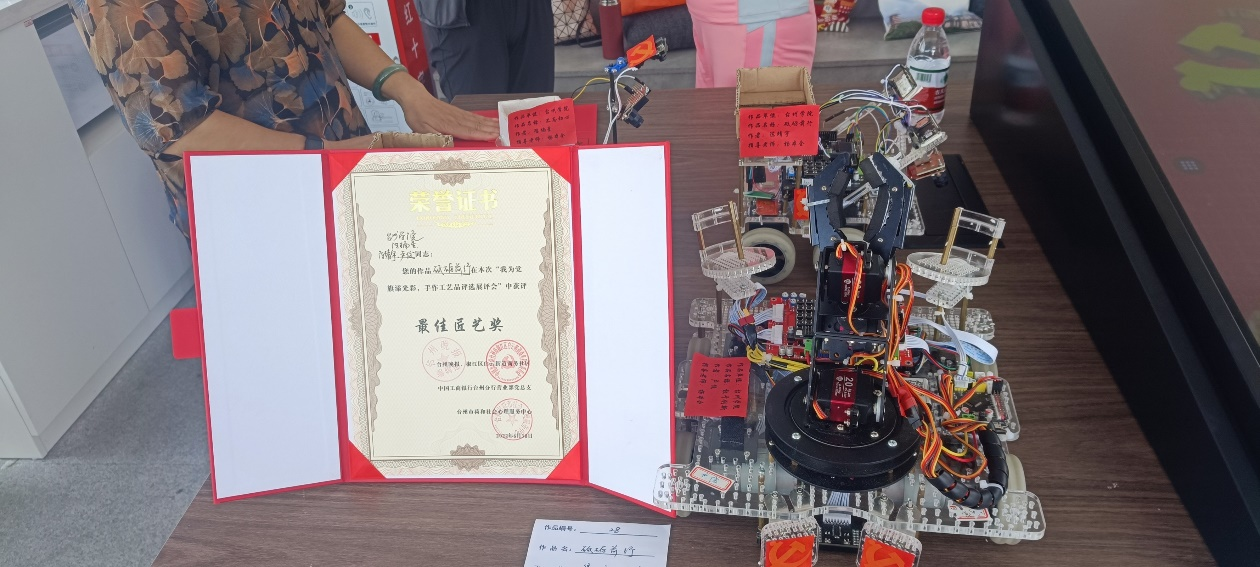 为庆祝党的101岁生日,实践队携带以“砥砺前行”为主题的智能车组参加在椒江现代天地广场党群先锋驿站举行的“我为党旗添光彩”手作工艺品评选大赛活动。实践队的参赛作品引起了评委及市民的强烈兴趣,大家纷纷竖起大拇指,表示作品极具创新性又非常考验耐力。作品最终获评“最佳匠艺奖”一等奖。