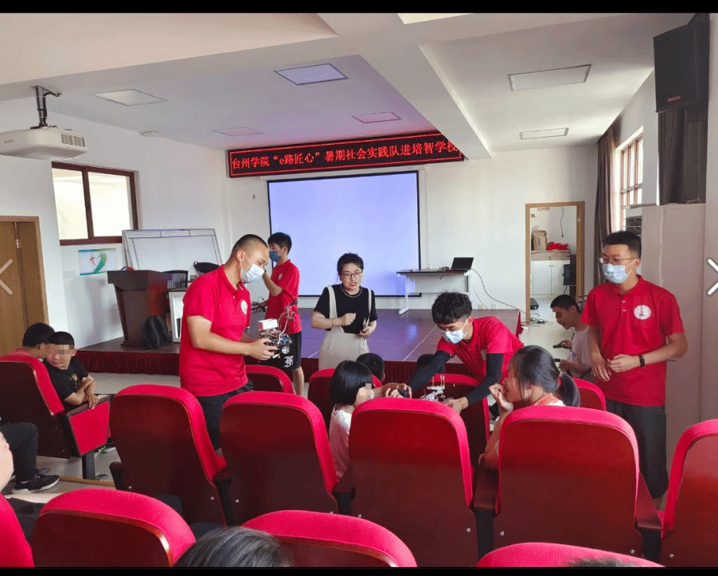 实践队还来到台州市培智学校,为培智学校的孩子们带去了智能小车、机器人,队员们对照实物和视频进行讲解,还拿着实物和孩子们近距离的互动,孩子们增长了见识。实践队同孩子们一起进行手工折纸,有的折成了飞机,有的折成了小船,还有的折成了青蛙,场面十分温馨热烈。另外,实践队为椒江剪纸名家、区剪纸非物质文化遗产传承人杨计兵老师做助教,陪着孩子们画图,剪纸,辅助他们完成作品。