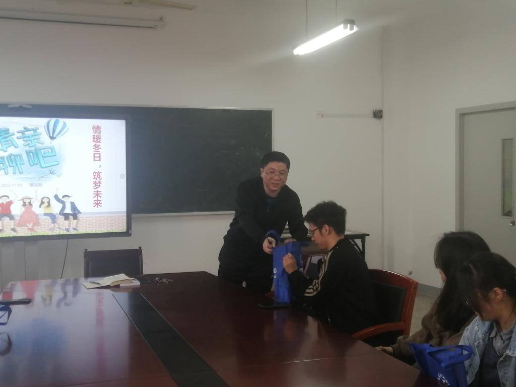 活动中,师生围绕知识改变命运讨论了大学学习的重要性,并且以自强不息、独立自主、诚实守信为切入点交流了大学期间成长成才的过程。冯荣结合自身的求学、奋斗和成长经历与在座的学生做了分享。他指出,家庭困难是一时的,并不可怕。虽然一个人没有办法选择自己的出身,但完全可以靠自己的努力,通过塑造思想、磨练意志、汲取知识、增长才干改变自己的命运,创造更美好的未来。驻足当下所有的付出都是值得称赞和他人艳羡的,面对困难唯有努力才有可能感动自己!他还表示这次的“青亲聊吧”活动传递的不仅是一份份暖冬礼包,更是心灵之间的温情传递,是学院关心关怀学生的切实举措。希望同学们将接受的这份温暖化为源源不断的动力,珍惜时光,努力学习,不负学院和老师的期望。