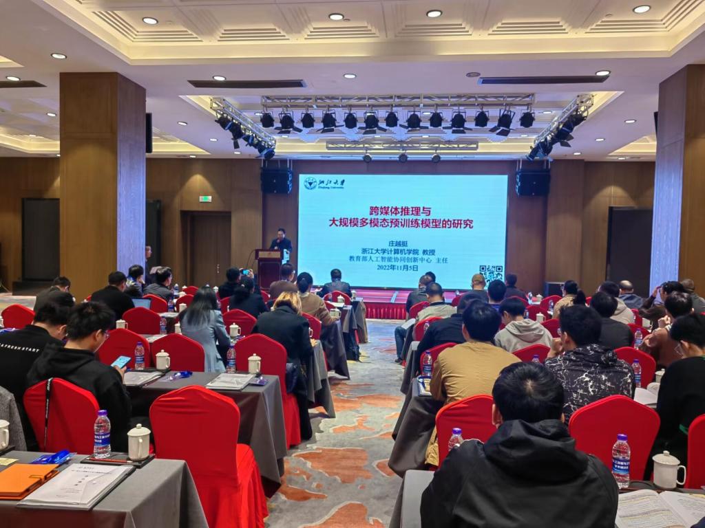 开幕式后,国家杰青、教育部长江学者、浙江省特级专家、浙江大学庄越挺教授,国际欧亚科学院院士、IEEE Fellow、华为云人工智能领域首席科学家田奇教授,国家杰青、哈尔滨工业大学(深圳)张民教授,国家杰青、浙江大学吴飞教授,国家杰青、杭州电子科技大学俞俊教授分别作了“跨媒体推理及大规模多模态预训练模型的研究”、“2022年的计算机视觉-挑战问题及潜在方向”、“序列生成模型中的随机性和基于笔画的Chinese NLP”、“新一代人工智能:赋能多学科交叉融合”、“通用多模态学习”等5场主旨报告。