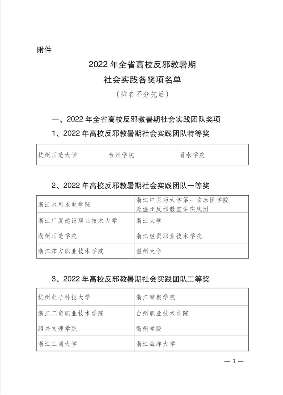 日前,浙江省高等教育学会思想政治教育分会、浙江省学生联合会、浙江省反邪教协会公布2022年浙江省高校反邪教暑期社会实践评选结果。我校电信学院“青春献礼二十大·聚力同心反邪教”实践团队在全省54支立项的高校团队中脱颖而出,荣获史上最好成绩——特等奖,指导老师冯荣获“优秀指导老师”称号;实践队员王琮蓉获“先进个人”称号,应佳瑶获“优秀学生干部”称号。