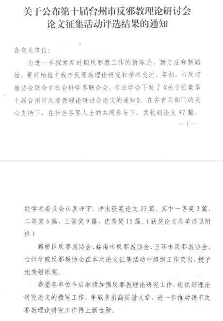 在近期举行的第十届台州市反邪教理论研讨会征文活动中,我校荣获优秀组织单位称号,同时我院师生共有5篇论文分获二等奖、三等奖及优秀奖。