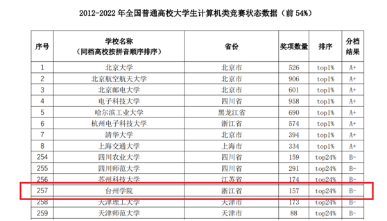 2023年4月8日,在重庆召开的第58·59届中国高等教育博览会上,全国普通高校计算机教育研究会、教师教学发展研究国家级虚拟教研室和研究报告专家工作组共同发布了《全国普通高校大学生计算机类竞赛研究报告》,我校在1134所进入统计名单的高校中排名第257。