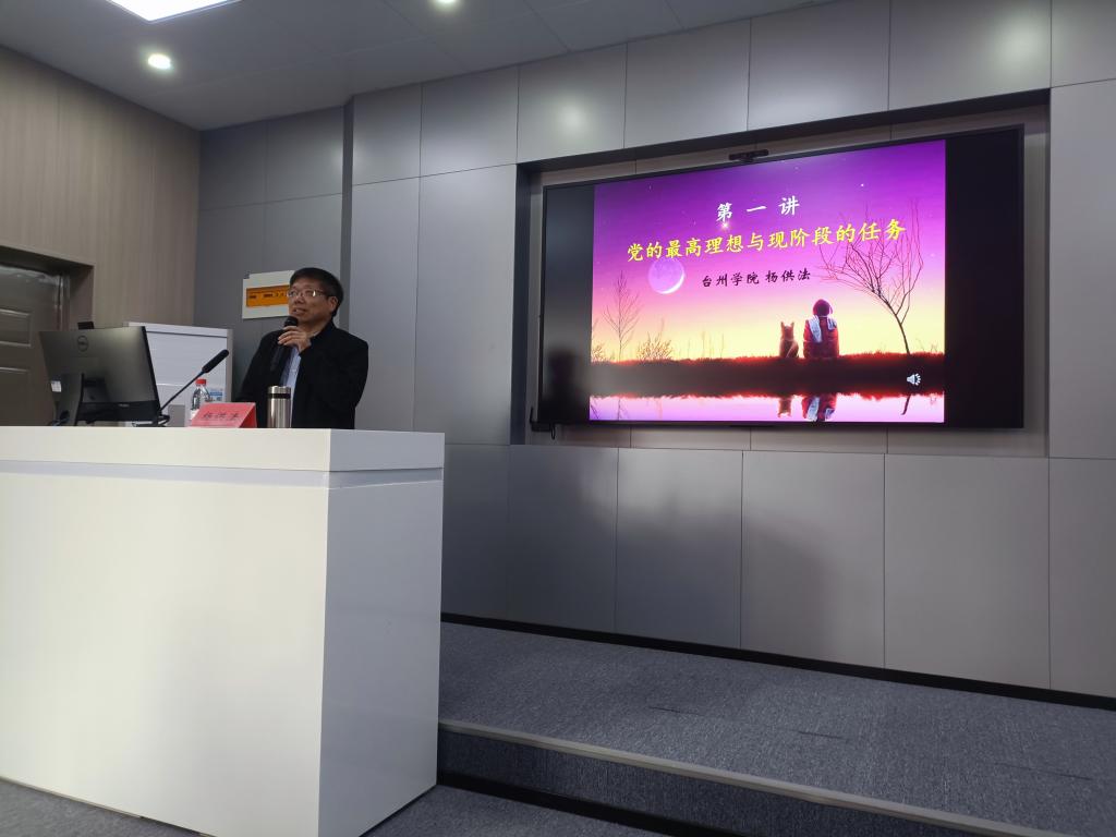 台州和合文化研究院副院长、马克思主义学院副教授杨供法以《党的最高理想与现阶段的任务》,深度剖析了个人理想和社会理想的含义,分析了当代人的个人生活理想,深刻阐释了如何把个人理想融入到社会理想中,并强调共产主义是人类社会的最高理想。杨老师表示,理想最基本的功能不是用来实现的,而是用来导航的,当代青年大学生尤其是入党积极分子们,要把远大理想与现实任务统一起来,为共产主义事业而奋斗。