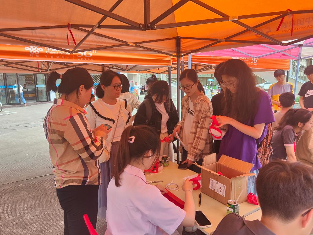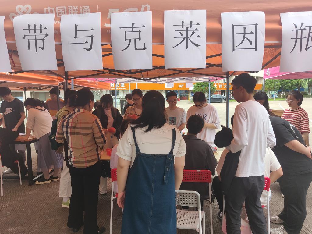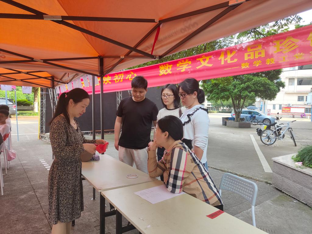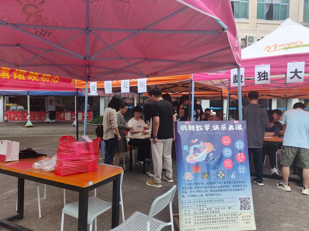 党徽熠熠映初心,数学文化品珍馐,为发挥党建引领作用,浸润数学文化,5月4日下午,电信学院数学教工党支部组织学生在临海校区广文超市门口开展“玩转数学,快乐无限”主题活动。