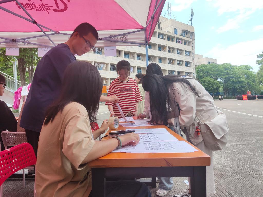 本次“玩转数学,快乐无限”活动,将抽象的数学知识与原理融入游戏中,以游戏的形式给同学们展示了数学隐藏在数字背后的别样魅力。活动中涉及到的游戏有:三门游戏、数独、闯关24点、魔方、莫比乌斯带和克莱因瓶等,每个游戏都被数学赋予了不同的乐趣,烈日骄阳也难以阻止同学们的热情。每个游戏摊位前都围满了人,同学们为一个个数学问题展开热烈讨论,努力寻找着最优的答案,时不时还会传来一阵解开难题的同学的笑语和一边观战同学的喝彩,洋溢着数学之美带给同学们的欢乐。