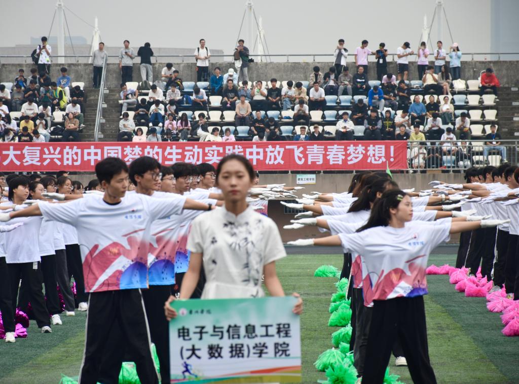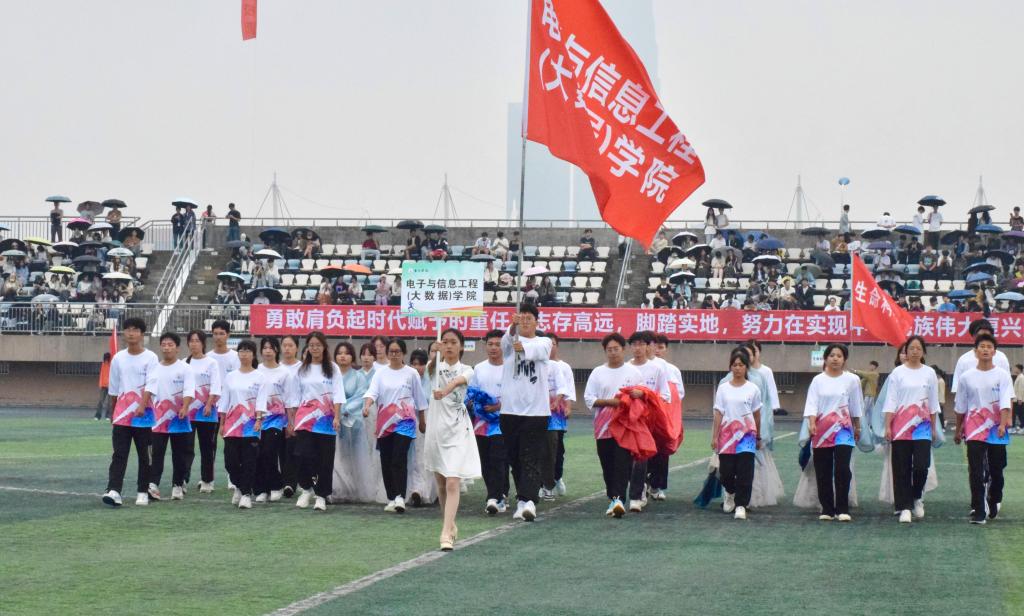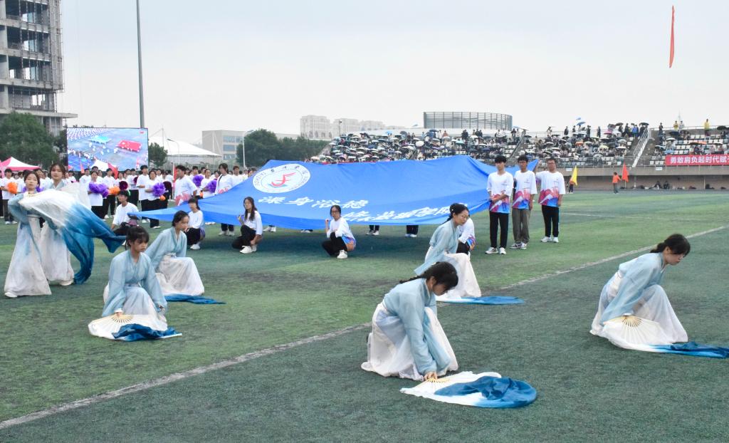 开幕现场,文体开花。运动会当天,田径场内,秋风渐起,踩着悦耳的旋律、伴着激昂的解说,电信学院方阵目光坚定、口号铿锵,展现了电信学子青春饱满的面貌。婉转悠长的《青花瓷》曲调中,国风舞蹈尽显电信学院的活力与激情。广播操赛场,他们动作整齐划一、迅速有力,激情洋溢、活力十足。